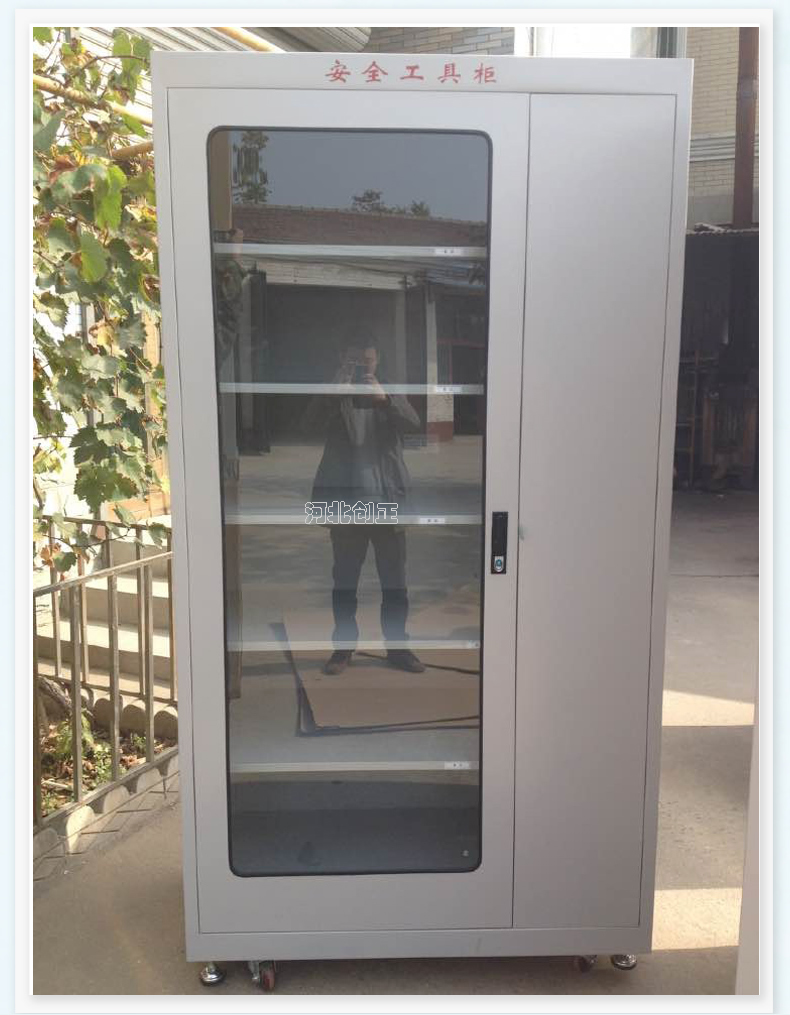 1、柜體是冷軋鋼板卷壓成型,厚度有1.0mm,1.2mm,1.5mm供選擇。柜體表面采用靜電防腐噴塑工藝,顏色為駝灰色,柜門裝有通體透明鋼化玻璃,透過玻璃可以看到分類有序的工器具。