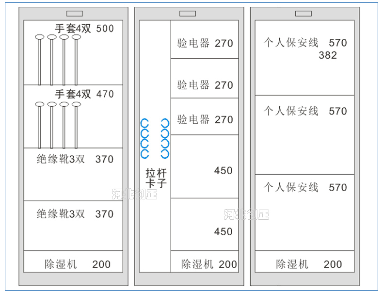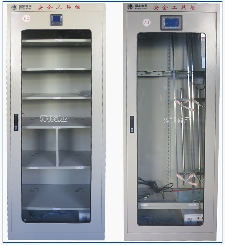 2、智能型安全工具柜裝有溫濕度顯示表和控制操作面板,顯示溫濕度和設(shè)備運行狀態(tài)。柜底可選擇安裝萬向輪和定位螺桿;柜頂可選擇安裝吊杯,方便運輸。應(yīng)用于不同溫濕度地區(qū)的不同電壓等級的變電站、集控站、線路工區(qū)以及電力公司等單位。