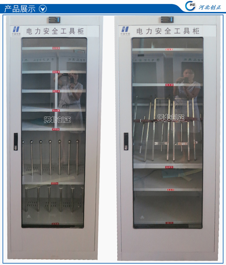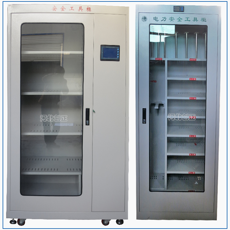 1、柜體是冷軋鋼板卷壓成型,厚度有1.0mm,1.2mm,1.5mm供選擇。柜體表面采用靜電防腐噴塑工藝,顏色為駝灰色,柜門裝有通體透明鋼化玻璃,透過玻璃可以看到分類有序的工器具。
