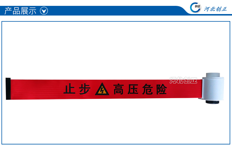 警示帶盒是ABS材料制成;帶是錦綸材質,上面印有“閃電符號,止步,高壓危險”等字樣。