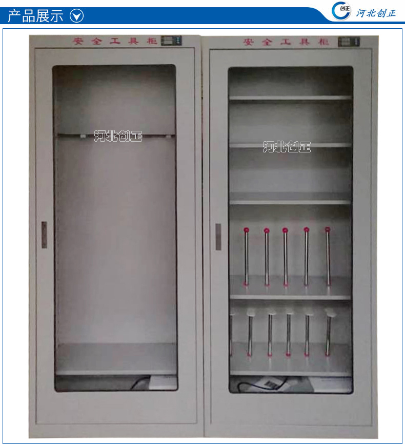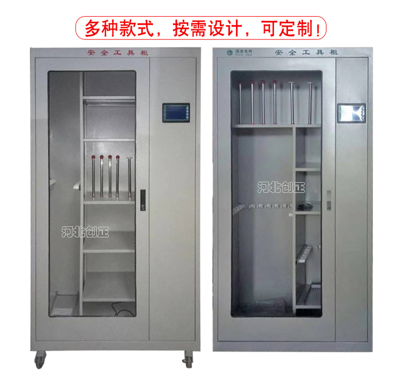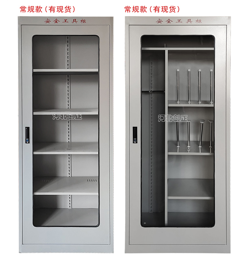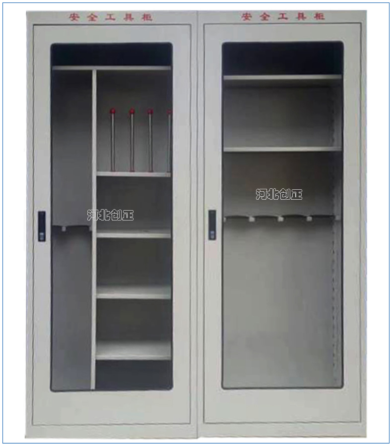 1、柜體是冷軋鋼板卷壓成型,厚度有1.0mm,1.2mm,1.5mm供選擇。柜體表面采用靜電防腐噴塑工藝,顏色為駝灰色,柜門裝有通體透明鋼化玻璃,透過玻璃可以看到分類有序的工器具。