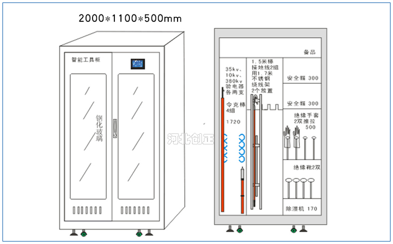 2、智能型安全工具柜裝有溫濕度顯示表和控制操作面板,顯示溫濕度和設(shè)備運(yùn)行狀態(tài)。柜底可選擇安裝萬向輪和定位螺桿;柜頂可選擇安裝吊杯,方便運(yùn)輸。應(yīng)用于不同溫濕度地區(qū)的不同電壓等級的變電站、集控站、線路工區(qū)以及電力公司等單位。