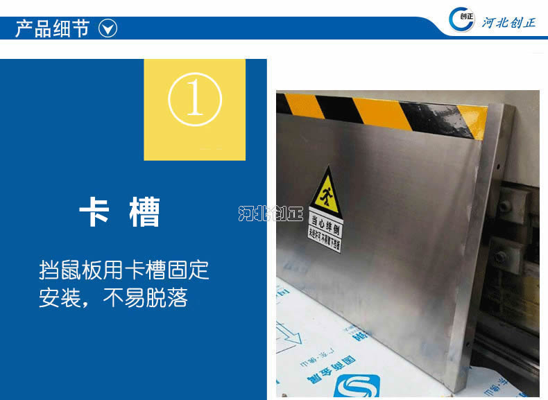不銹鋼擋鼠板表面經(jīng)防腐處理。擋板上部貼有黃黑相間的反光條,起到警示作用。